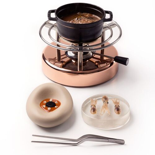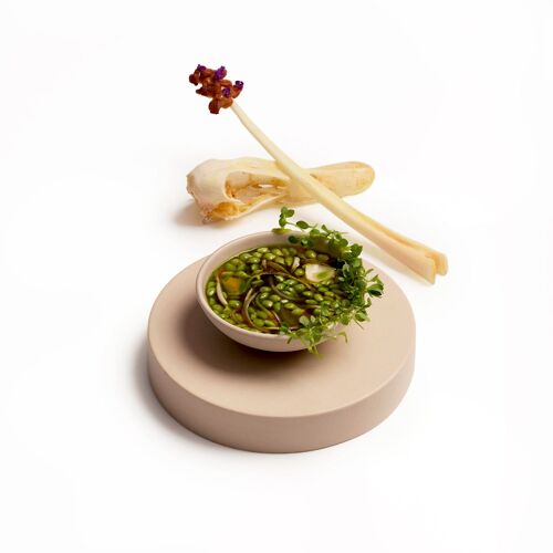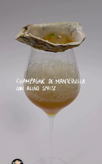 Egy másik folyékony őrület a vajas pezsgő, amely egy 2000-es évjáratú pezsgő seprőjéből készül, pirított vajjal, vaníliával és fűszerekkel ízesítve, és még egy kis ecetes spritz is megy bele. Olyan a textúrája, amely megtéveszti a szemet és a szájat, és az érlelt pezsgők briósos aromáit idézi. És hogy ne legyen túlságosan kerek a koncepció, alkoholmentes manzanillában és ponzuban pácolt osztriga rázza fel a gyanútlan fogyasztót a champagne-os álmokból.